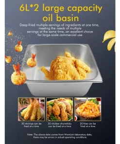 - LARGE CAPACITY & HIGH PERFORMANCE – Prepare mouthwatering meals for the whole family with Deep Fryer. Its 2* 6L/5.6-quart oil container allows you to make 19 cups of delicious food. The powerful 3200W heating element ensures fast heat-up and keeps a constant temperature, delivering quick frying and the perfect crispiness that will satisfy everyone’s taste buds.